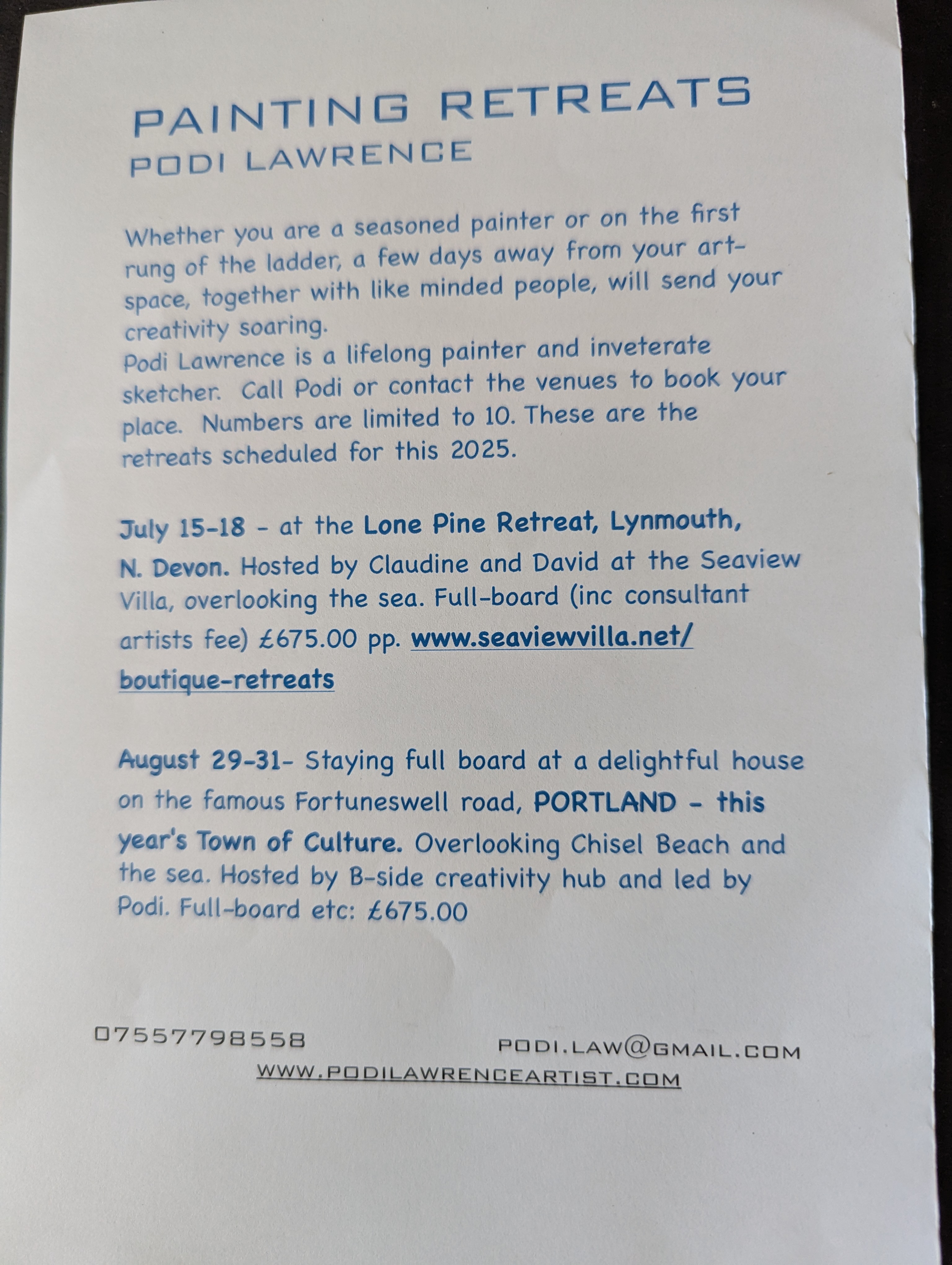 Podi Lawrence – well known artist based in Portland who hosts painting courses – see website www.podilawrenceartist.com for more information. Future courses planned are: